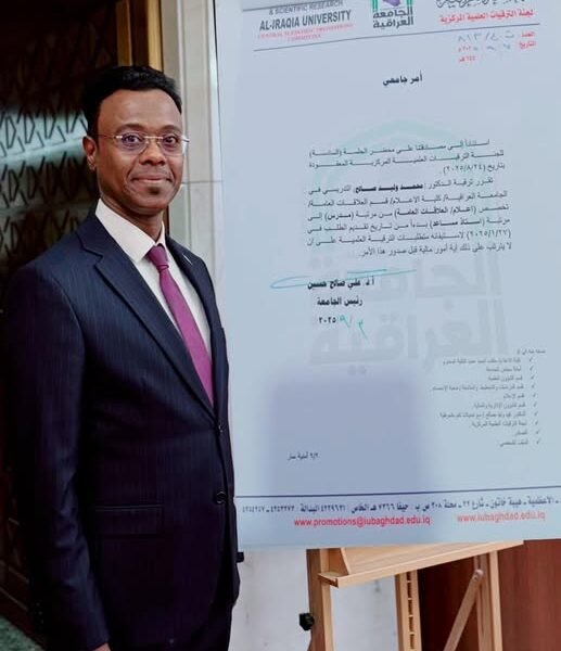 تتقدم جمعية العلاقات العامة العراقية(ايبرا)؛ بأسمى آيات التهاني والتبريكات إلى الدكتور (محمد وليد صالح) عضو هيئة تحرير مجلة ايفي لي للعلاقات العامة ، وذلك بمناسبة ترقيته العلمية إلى مرتبة أستاذ مساعد، تقديراً لجهوده العلمية المتميزة، وعطائه الأكاديمي المثمر في ميدان العلاقات العامة والعلوم ذات الصلة.